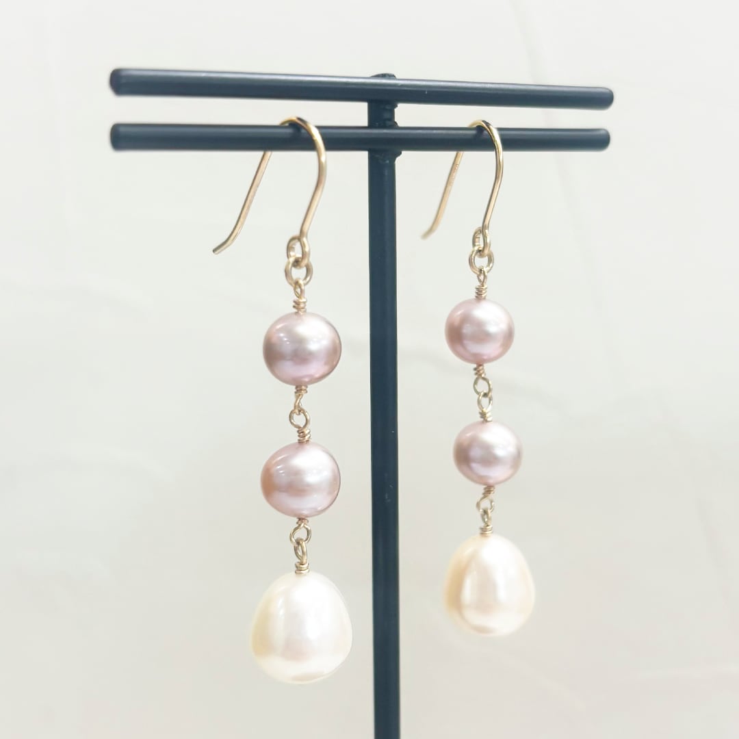 ・ラベンダーとホワイトカラーの淡水真珠を縦に配したロングシルエット。
