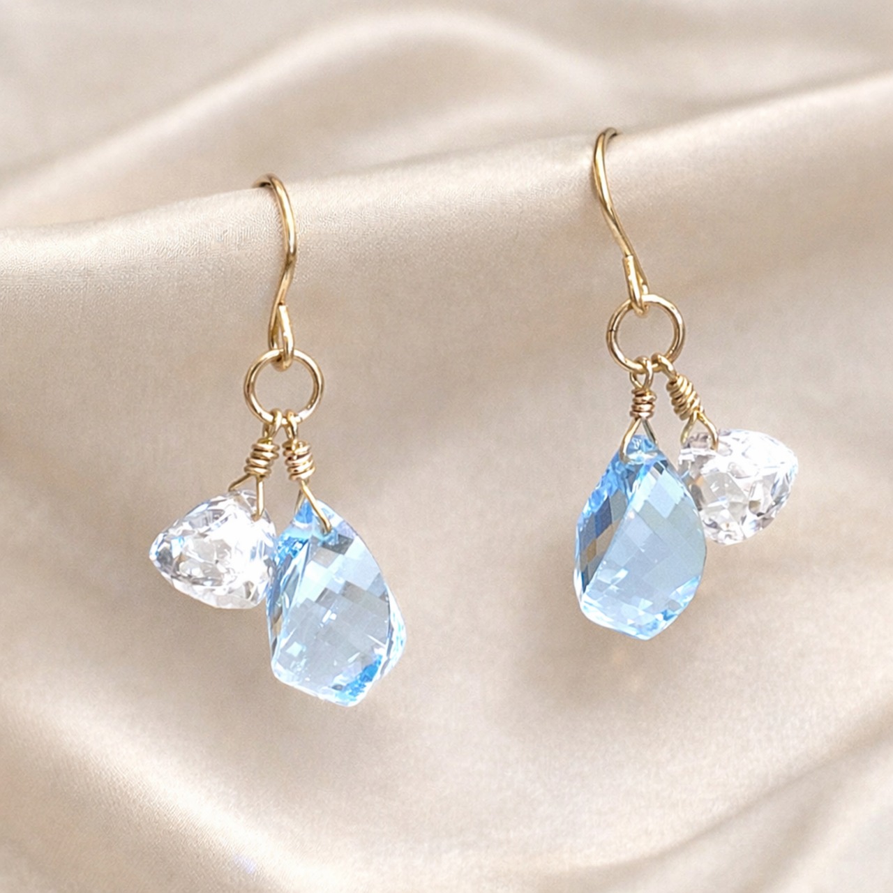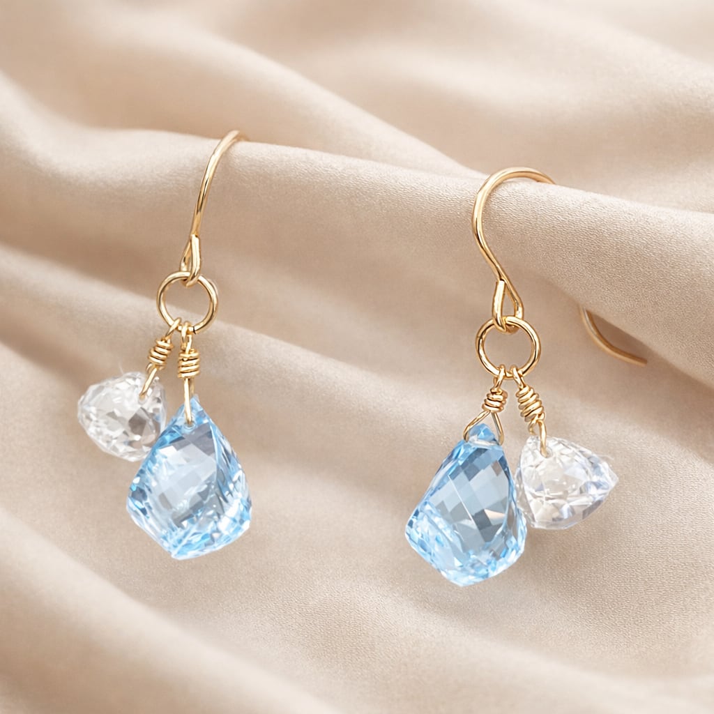 ツイストカットのブルートパーズが澄んだ青を放ち、細かなカットのロッククリスタルが光を受けて繊細にきらめきます。