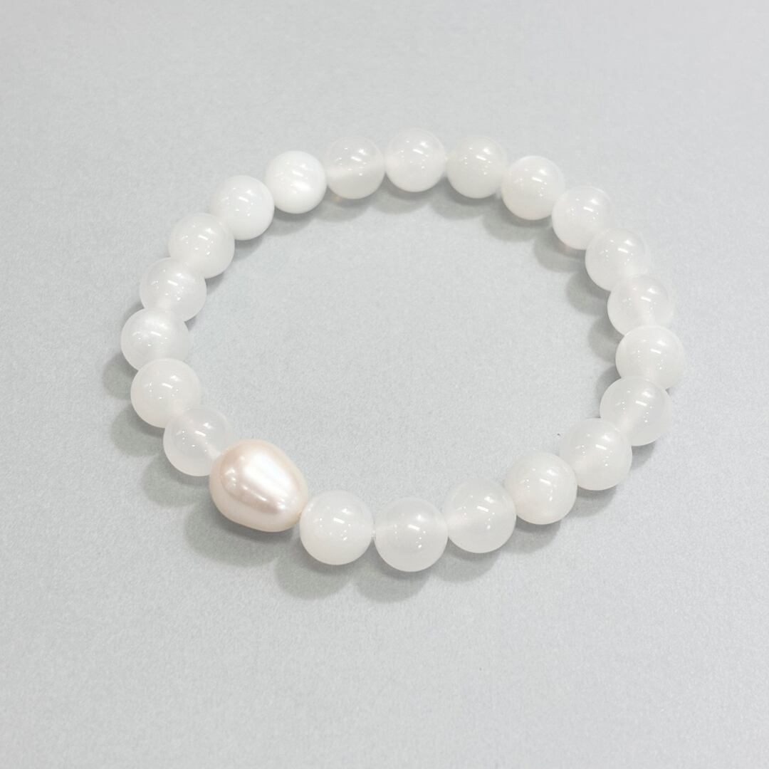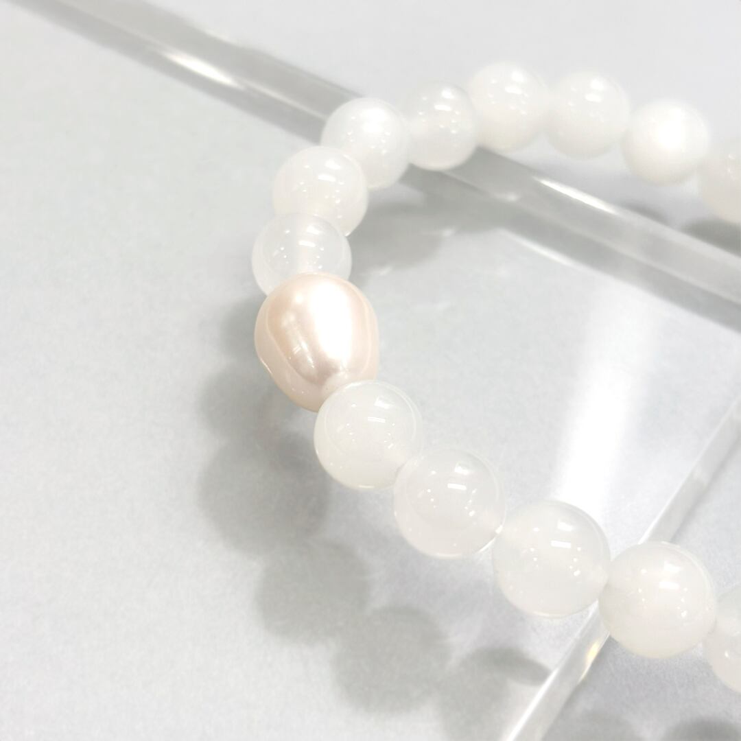 ホワイトカラーのムーンストーンを連ねた中に、一粒の淡水真珠をあしらい、手元にやさしく落ち着いた印象を添えます。