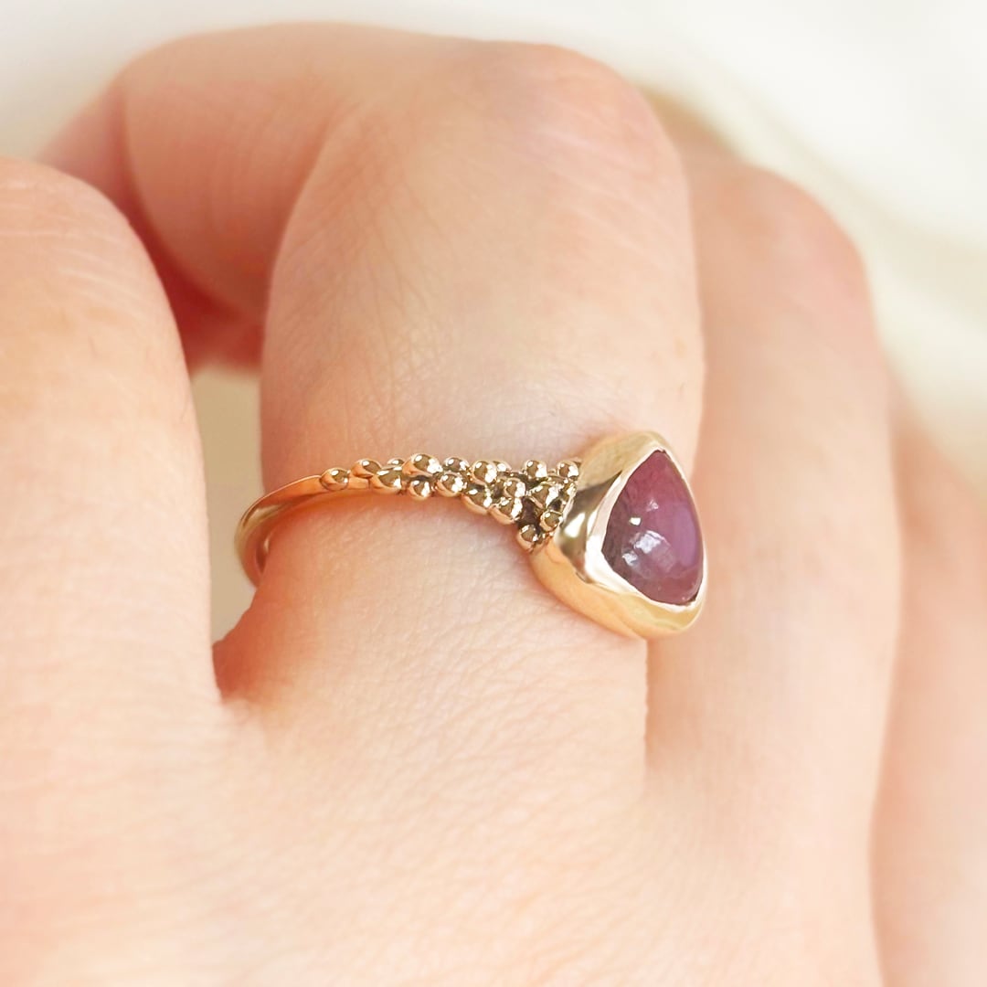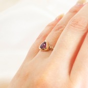 アームに朝露をあしらい、宝石を花に見立てたリングです。