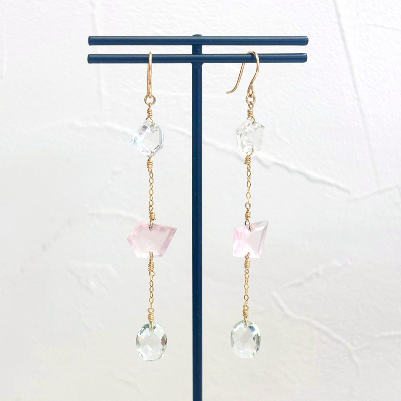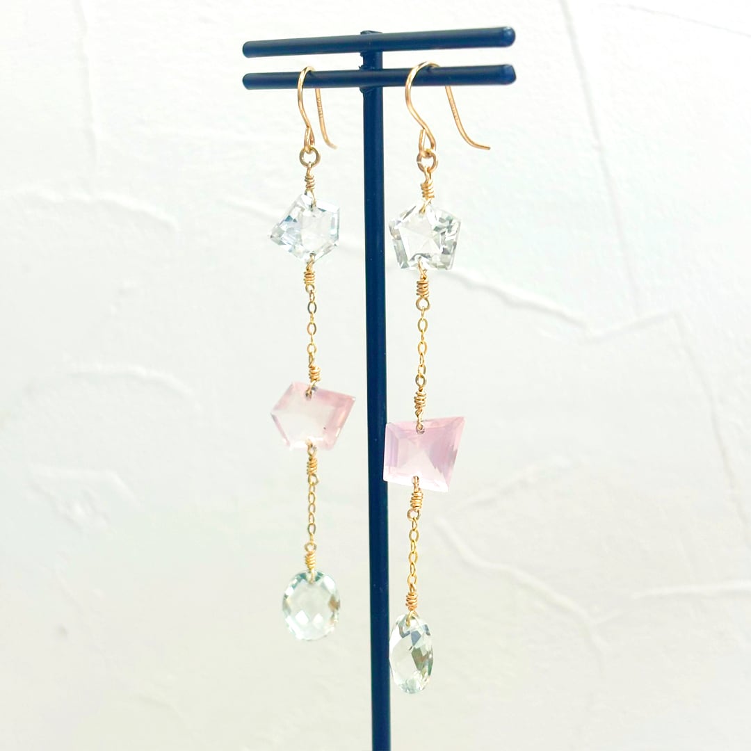 淡い色合いのローズクォーツとグリーンクォーツ、透明感のあるロッククリスタルのアイテムです。